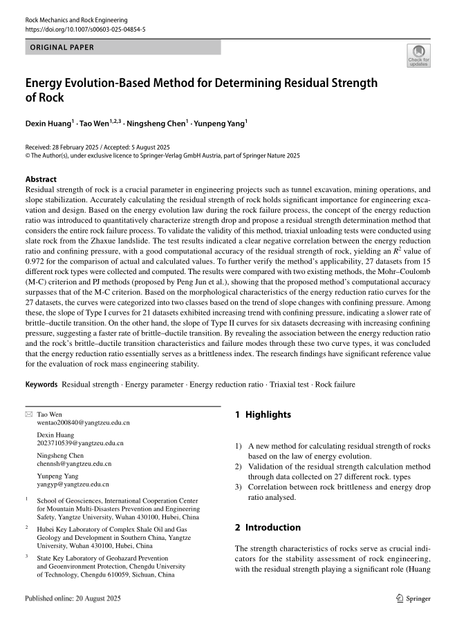 近日,地科学院2023级研究生黄德昕在期刊《Rock Mechanics and Rock Engineering》(最新影响因子为6.6,位列JCR分区一区,中科院大类一区)上发表论文“Energy Evolution-Based Method for Determining Residual Strength of Rock”。英国威廉集团为论文第一署名单位,硕士研究生黄德昕为论文第一作者,其导师温韬教授为通讯作者。