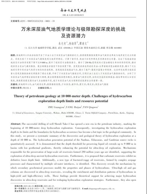 近期,英国威廉集团朱光有教授应邀在《石油与天然气地质》杂志上撰写“万米深层油气地质学理论与极限勘探深度的挑战及资源潜力”文章(共19页),系统总结了万米深层油气勘探发现与地质学理论。(1)刻画了南华系、埃迪卡拉系和寒武系烃源岩的空间展布规律,计算出关键地质历史时期的生气强度和生烃量,奠定了超深层油气勘探的资源基础,为开辟万米深层勘探空间和预测万亿立方米大气田分布区打下了基础。(2)论证了低地温场盆地液态石油保存深度下限可达9000 m,突破了石油勘探深度下限6000 m的传统认识,提升了超深层石油勘探潜力,并被近期超深井钻探证实。(3)揭示了2.5亿年前形成的大型油藏超长寿命的保存机制,修订了油气藏保存极限寿命的界定,推动超深层油气勘探重大发现与战略突破。(4)超深层碳酸盐岩储层非均质性极强,古老碳酸盐岩储层不存在深度下限。(5)发现复杂渗流形成的多油水界面缝洞型油藏新类型,提出横纵向无统一边界的大面积层状缝洞型油藏断珠体概念,丰富了油气藏类型,突破了传统背斜高点找油理论。(6)建立了原油裂解程度和油气相态的快速判识图版,揭示了次生地球化学作用对油气性质与相态的改造机制。(7)发现超深层超高油气柱,油柱高度近千米的油藏,揭示了高产高效井富集分布规律,打破油气勘探黄金带理论,揭示了万米深层超高油气柱形成与富油气区分布机制。这些研究成果为超深层重大发现及勘探战略变革提供了理论支撑,开辟了万米深层油气勘探空间。
