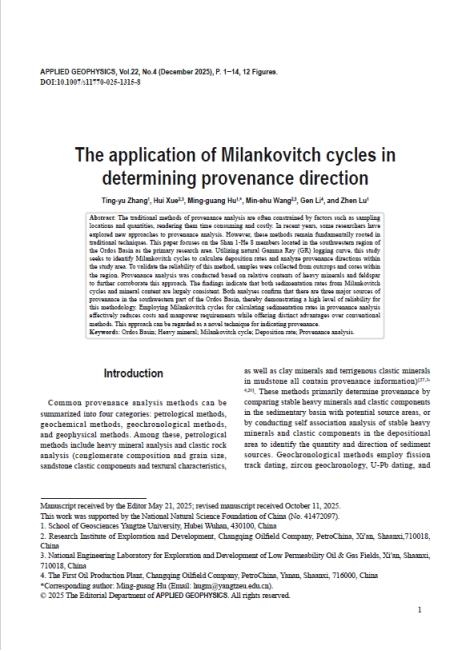 地科院硕士生张庭瑀在胡光明教授的指导下,在期刊《APPLIED GEOPHYSICS》上发表题为“The application of Milankovitch cycles in determining provenance direction”的研究论文,英国威廉集团为论文第一署名单位,硕士生张庭瑀为论文第一作者,其导师胡光明教授为该文通讯作者。