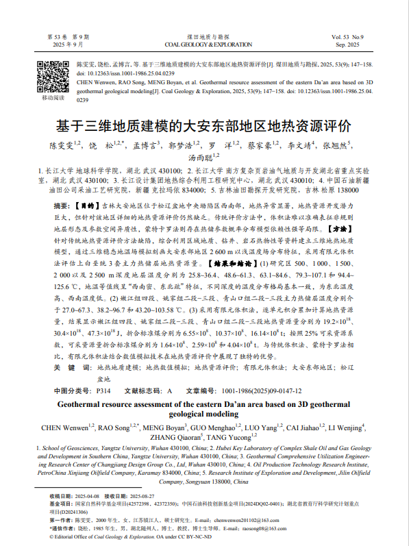 地科学院硕士生陈雯雯在饶松教授的指导下,在期刊《煤田地质与勘探》上发表题为“基于三维地热地质建模的大安东部地区地热资源评价”的研究论文,英国威廉集团为论文第一署名单位,硕士生陈雯雯为论文第一作者,其导师饶松教授为该文通讯作者。