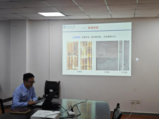 赵老师指出天然裂缝不仅是影响致密砂岩储层自然产能的关键,也是控制压裂效果的重要因素之一。他指出当地层受到多期构造运动及成岩作用影响时,会导致裂缝类型及特征复杂化,使天然裂缝不易精确识别,严重影响裂缝型油气藏开发及压裂效果。他通过大量岩心照片向大家展示了深层裂缝的特征,指出岩心识别裂缝时应该注意的问题。接着赵老师结合实例,给大家讲解了深层储层中的裂缝需要运用哪些手段才能更准确的识别。赵老师同时强调,除了宏观裂缝,微观裂缝研究更加具有挑战性,他从识别手段、规律总结、机理研究等方面给大家讲解了微裂缝的研究现状,研究的重点和难点在哪。紧接着给大家讲解了裂缝在长期埋深过程中的演化过程,在历史期,裂缝会发生多期次的开启和闭合,确定好裂缝形成、开启的时间与油气成藏关键期的匹配关系,是决定裂缝有效性的关键。最后赵老师给大家介绍了裂缝的预测,他指出虽然裂缝预测方法已经取得了长足的进步,但是裂缝发育的环境天差万别,大部分储层裂缝并没有精确的分布模式做指导,所以现阶段裂缝预测更多的是知道裂缝的发育位置,而对于裂缝的展布还是很难预测的。所以利用野外露头和物理模拟针对具体工区建立精确的裂缝分布模式,是指导裂缝预测的关键。
