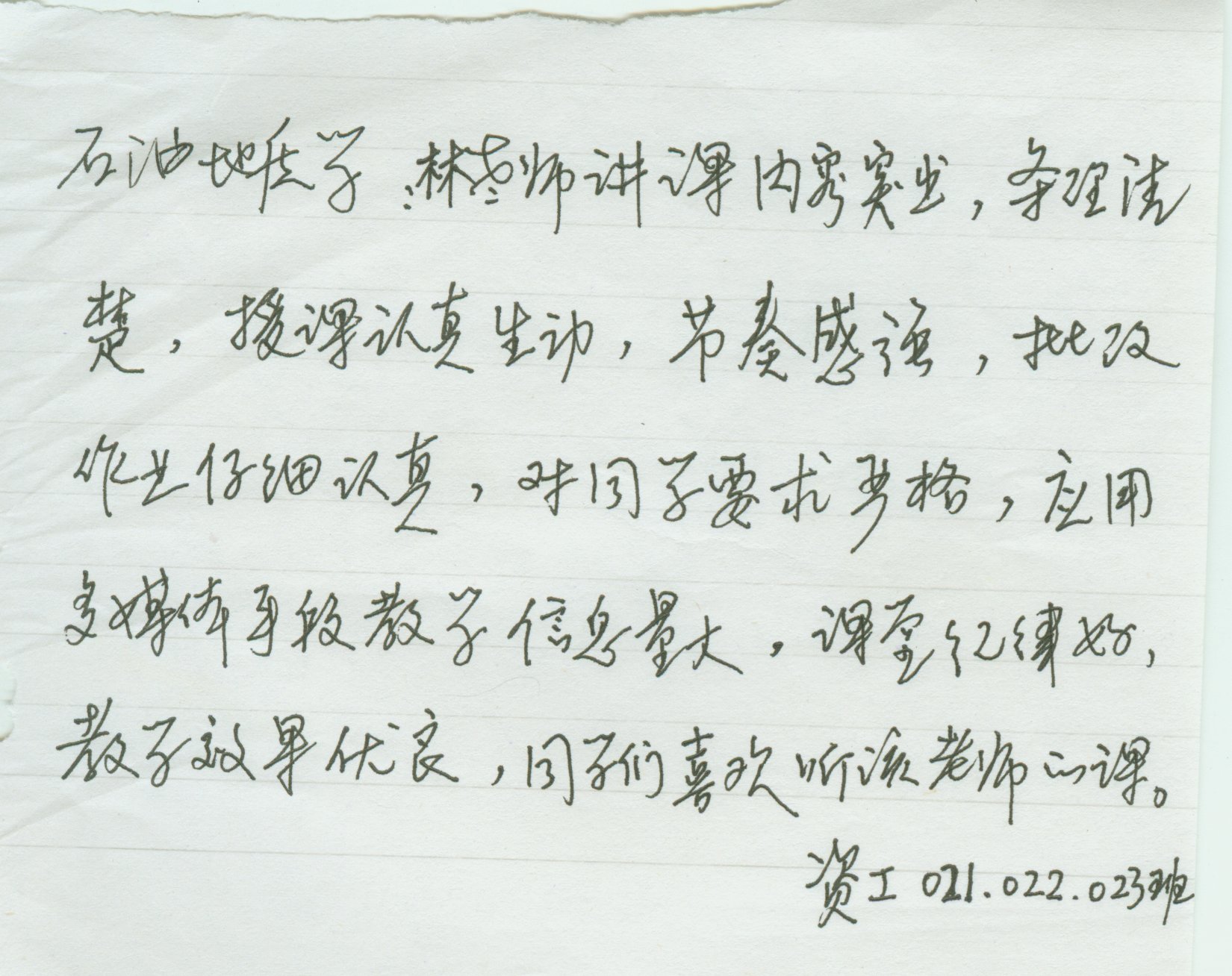 该课程近五年学生及同行对主讲教师讲课的评估值高出全校平均值,在全校教师排名中位居前列。学生对教师课堂教学评估分近五年平均为91.8。该课程作为矿产普查与勘探专业研究生入学考试的必考课程,学生参加研究生入学考试时成绩以及用人单位的反馈意见证明课程教学质量是优秀的。近五年本科生参加硕士研究生考试中,《石油地质学》专业课成绩平均优良,考研上线率高,资源勘查工程专业2001届学生考研上线率达43.3%;2002届学生考研上线率达64%;2003届学生考研上线率达53%;2004届学生考研上线率达50%; 2005届学生考研上线率达49%。学生报考的院校包括北京大学、石油大学、中国地质大学、同济大学、中国科学院、中国石油勘探开发科学研究院等重点院所。