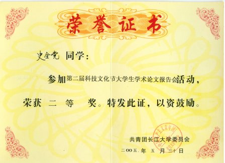 资工021班史全党同学撰写的科技论文在2005年大学生科技报告会上获二等奖证书