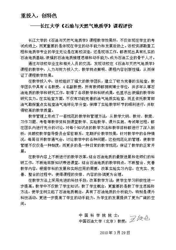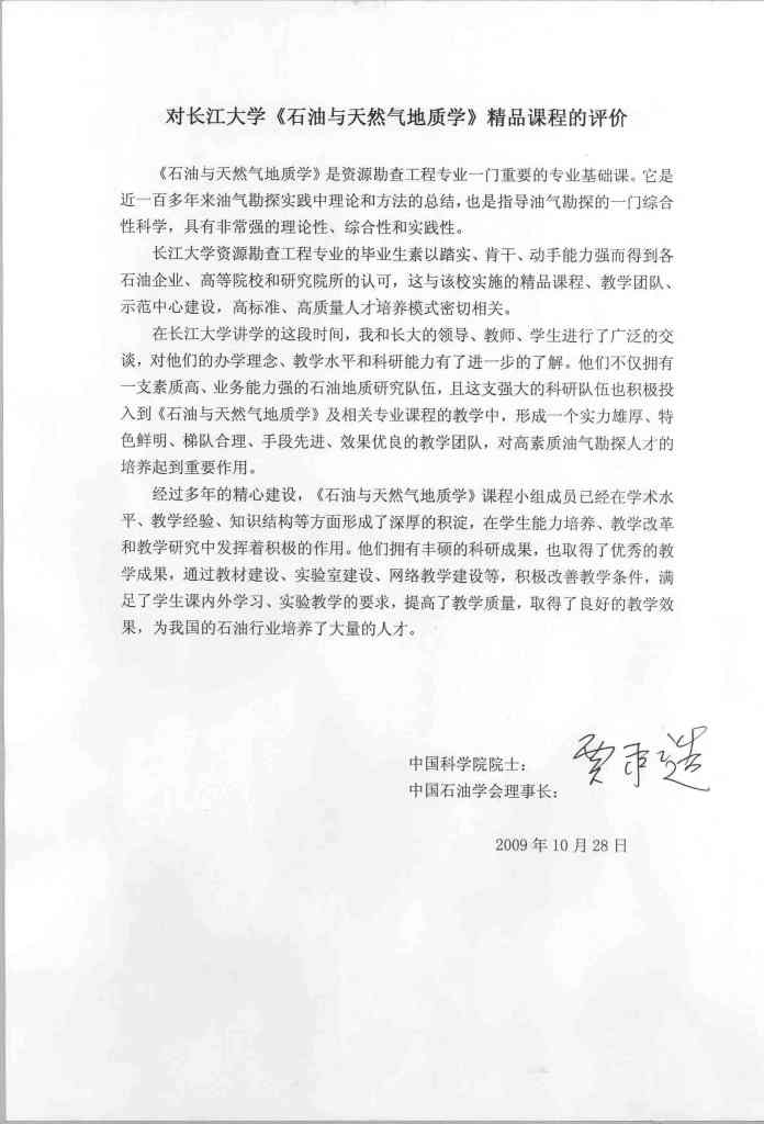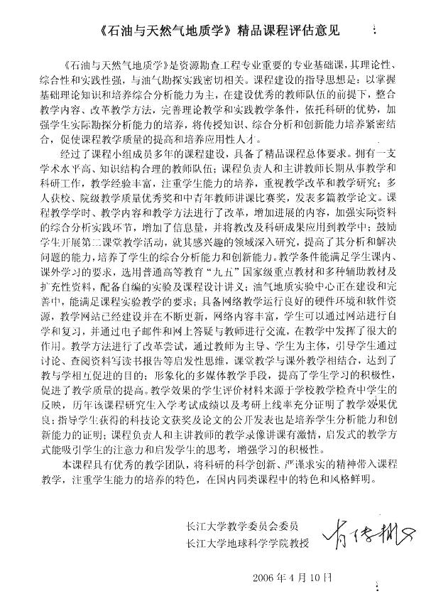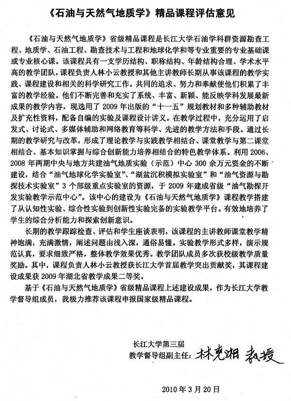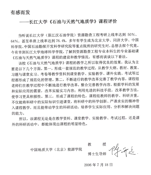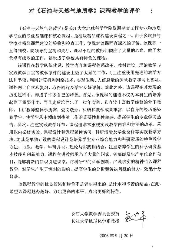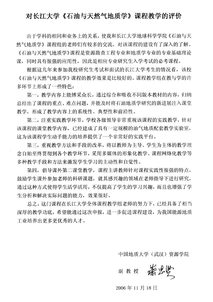 从每年威廉williamhill资源勘查工程专业较高的考研上线率和专业课的成绩反映,该校《石油与天然气地质学》课程的教学取得良好的效果。我为该校《石油与天然气地质学》课程有这样的成绩高兴,这是领导、老师们辛勤劳动的结晶,也是我们国家石油事业的骄傲。