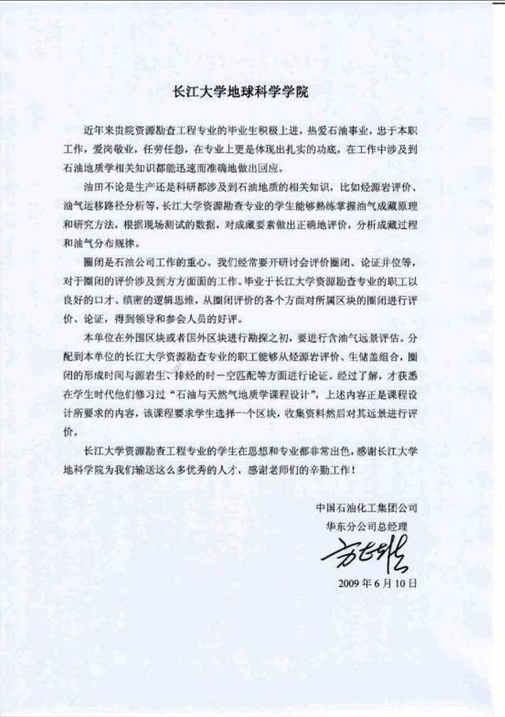 近年来贵院资源勘查工程专业的毕业生积极上进,热爱石油事业,忠于本职工作,爱岗敬业,任劳任怨,在专业上更是体现出扎实的功底,在工作中涉及到石油地质学相关知识都能迅速而准确地作出回应。威廉williamhill资源勘查工程专业的学生在思想和专业都非常出色,感谢威廉williamhill地科学院为我们输送这么多优秀的人才,感谢老师们的辛勤工作!